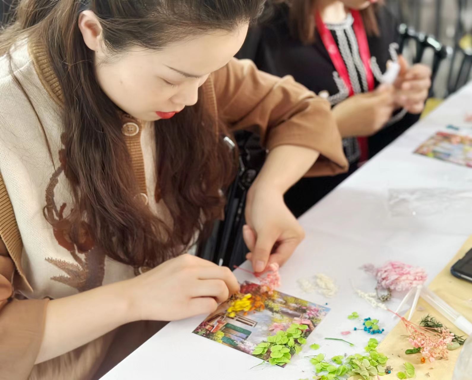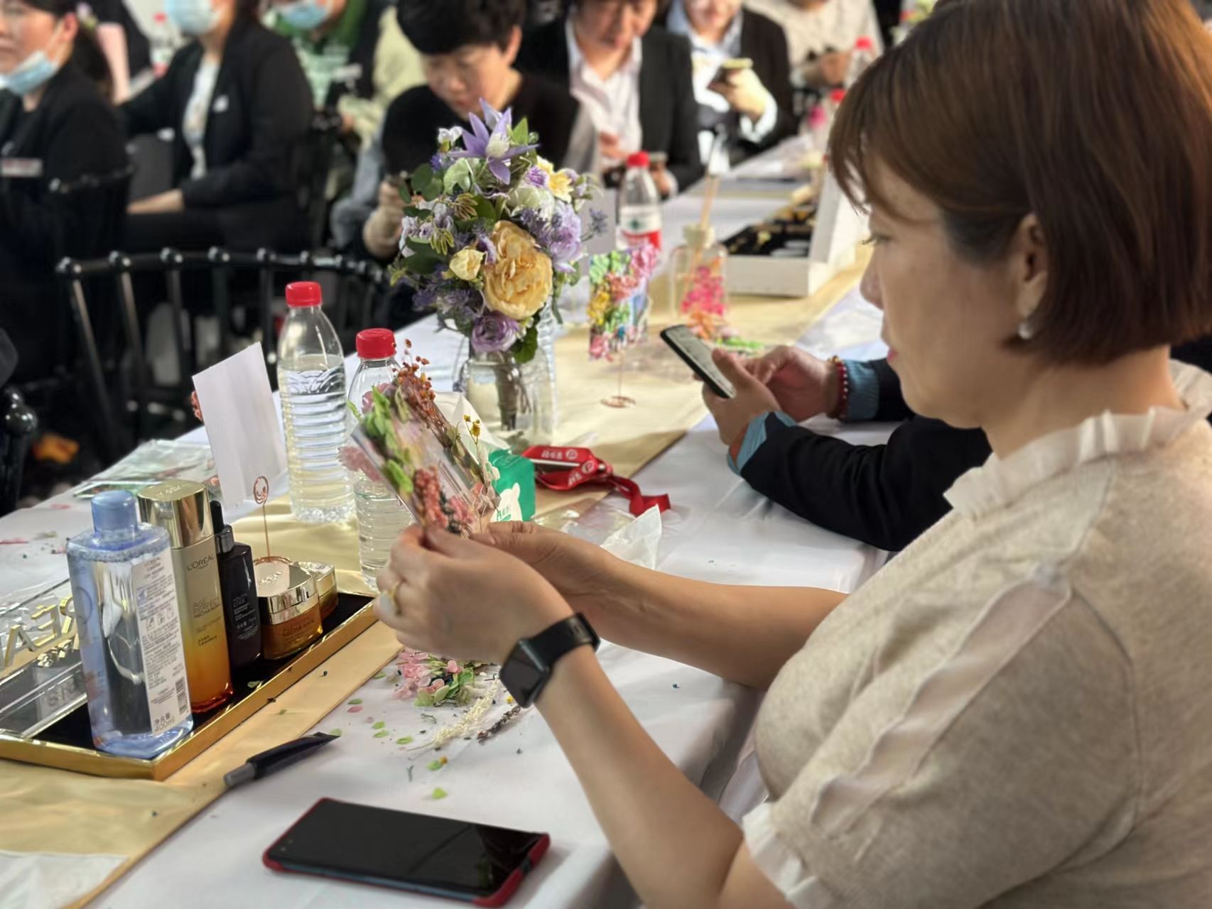 隨后由歐萊雅廠商進(jìn)行了活動介紹。在優(yōu)雅的古典音樂及清新淡雅的香氛中,大家開始了各自的創(chuàng)作:按照自己的構(gòu)思用鑷子挑起不同的干花,輕輕放在模具上,細(xì)心調(diào)整位置并固定,盡情創(chuàng)造屬于自己的美麗。